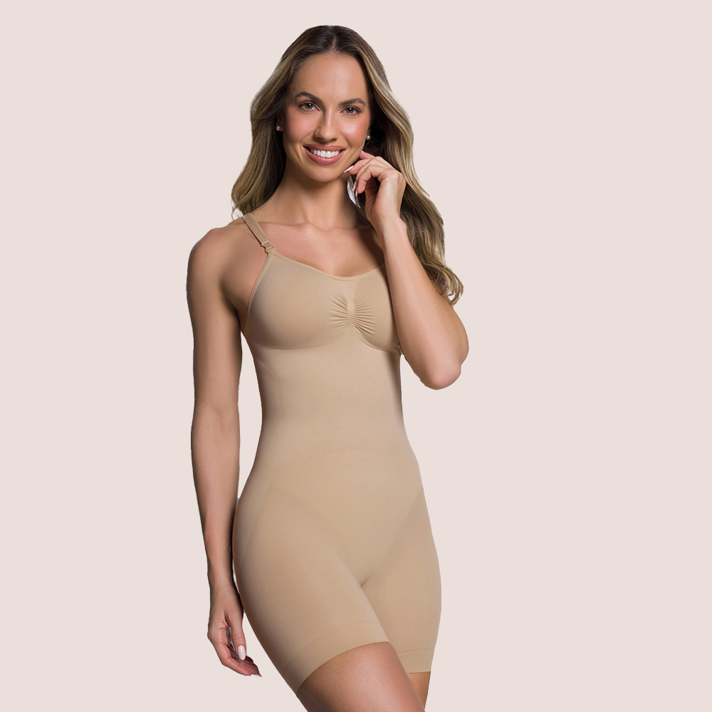Modelo UP: Confeccionado em um linha de modeladores desenvolvido com o conceito sem costura e com conforto que modela, define e reduz suas curvas, altamente compressivo, leve e macio. Busto anatômico, sem aro, com alças reguláveis e fecho em click plástico, facilitando a remoção. Modela a cintura, comprime o abdômen e levanta bumbum. Pernas cavadas com acabamento em elástico suave. Abertura higiênica no entrepernas. Costas retas, na altura do busto.